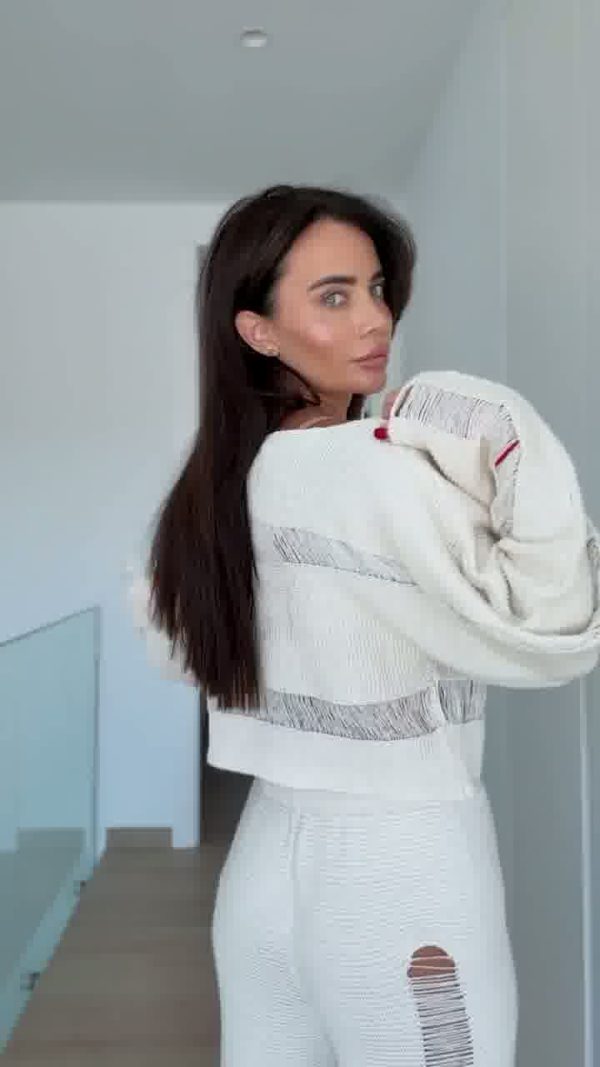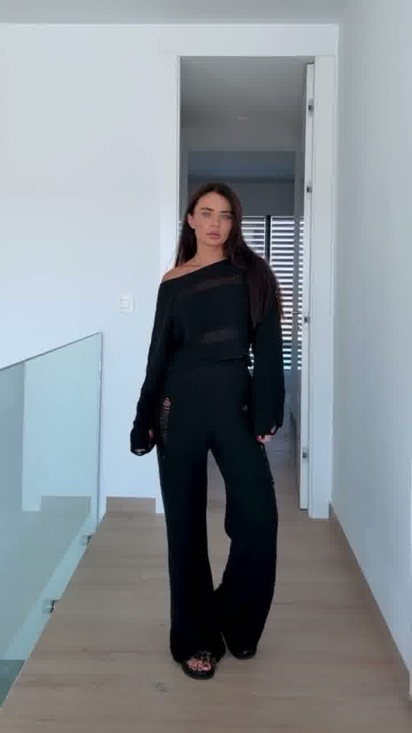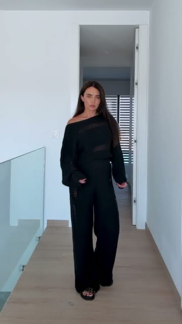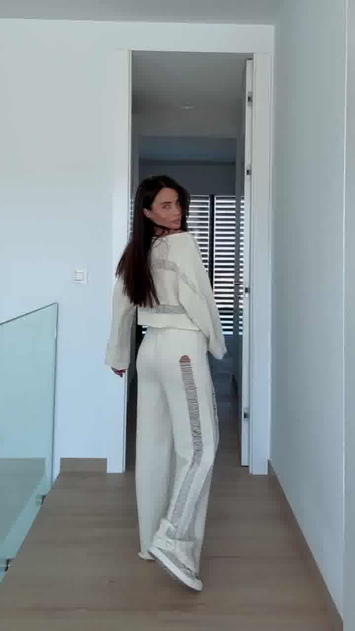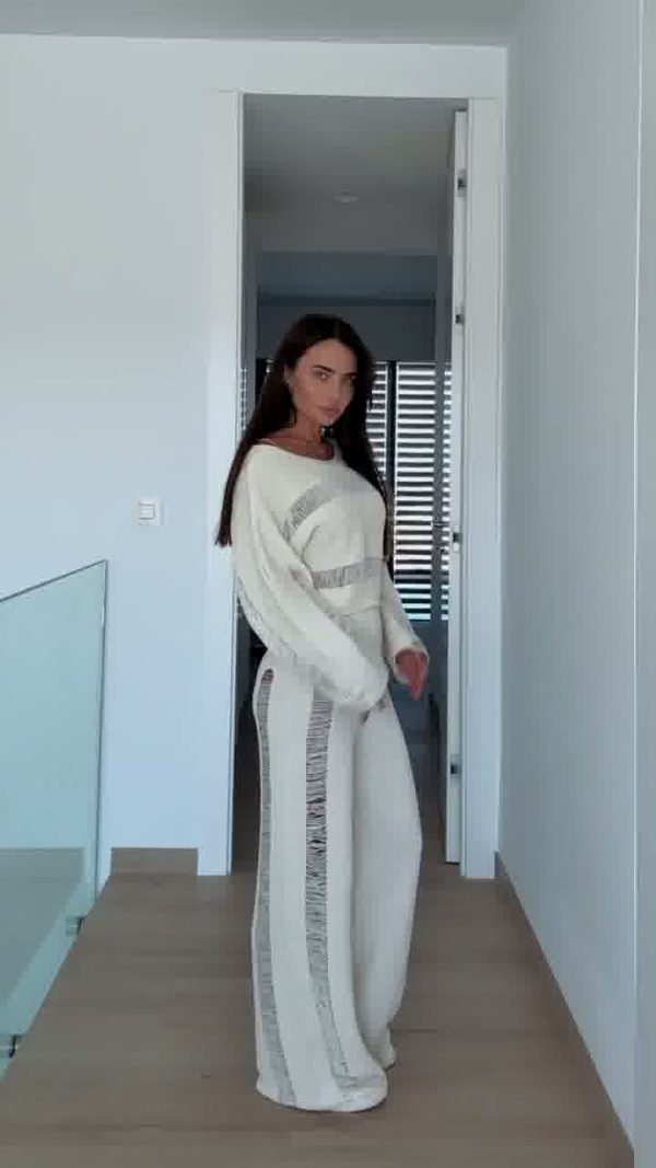 Damski dwuczęściowy garnitur z dzianiny. W zestawie: sweterek, spodnie. Idealny na wyjście do biura lub na imprezę.