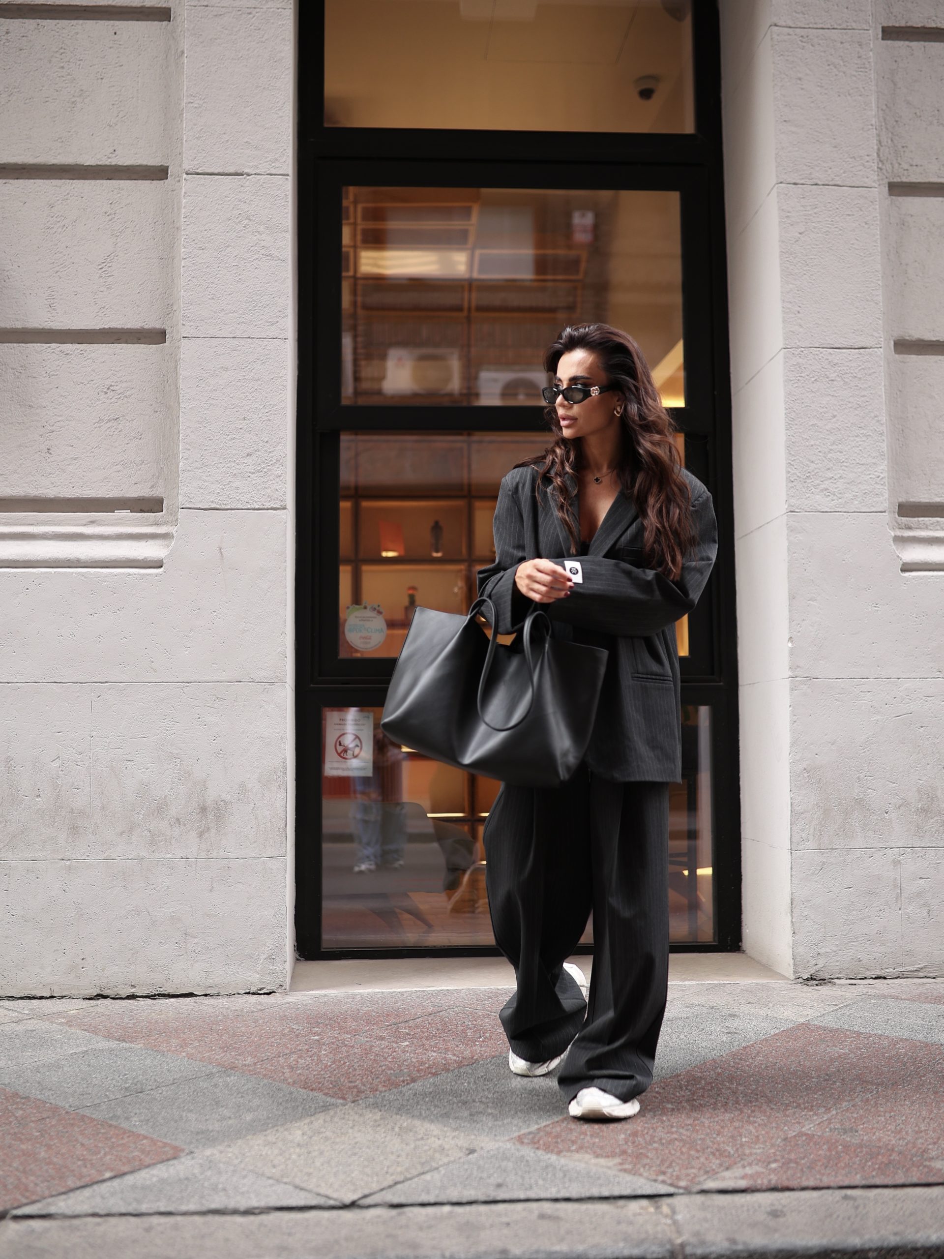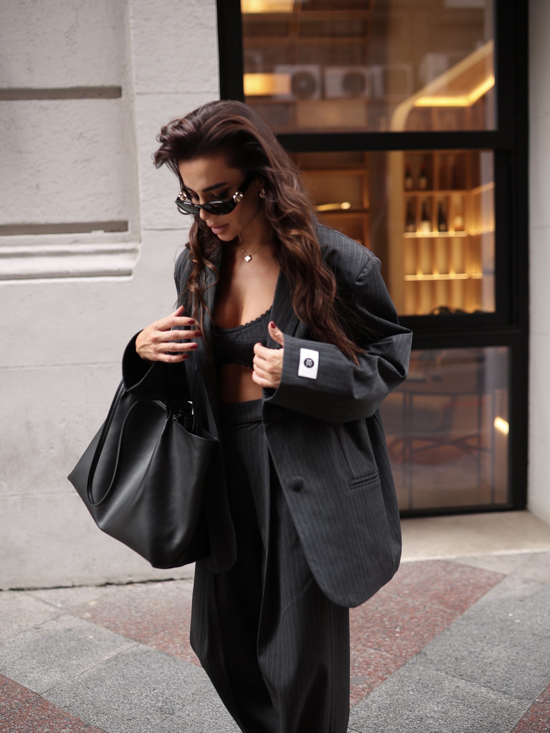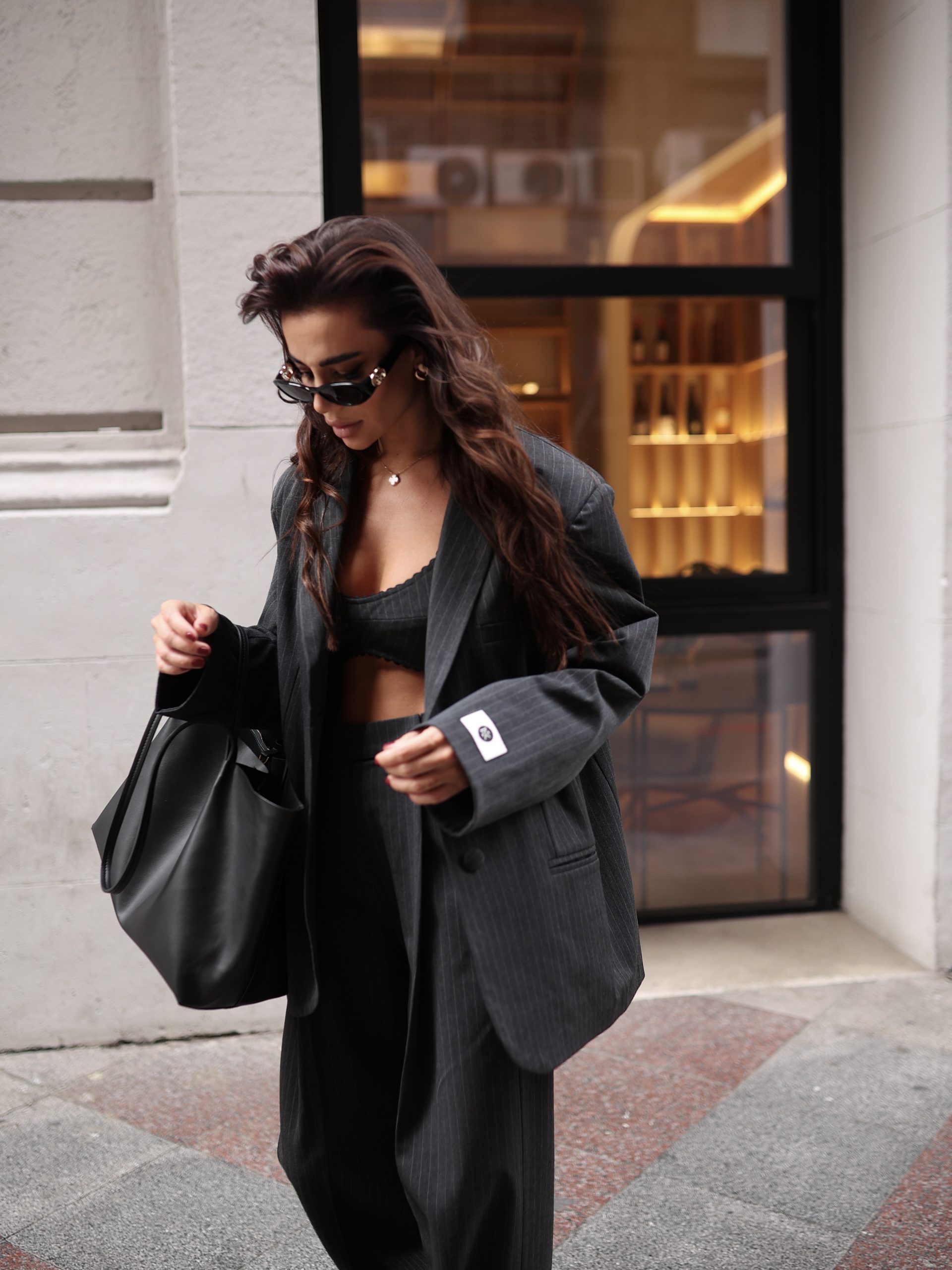 Nowoczesny damski komplet trzyczęściowy: marynarka, spodnie i top. Styl inspirowany miejską elegancją i trendami street style. Oversize’owa marynarka w połączeniu z dopasowanym topem tworzy bardzo kobiecy, a jednocześnie mocny look.
