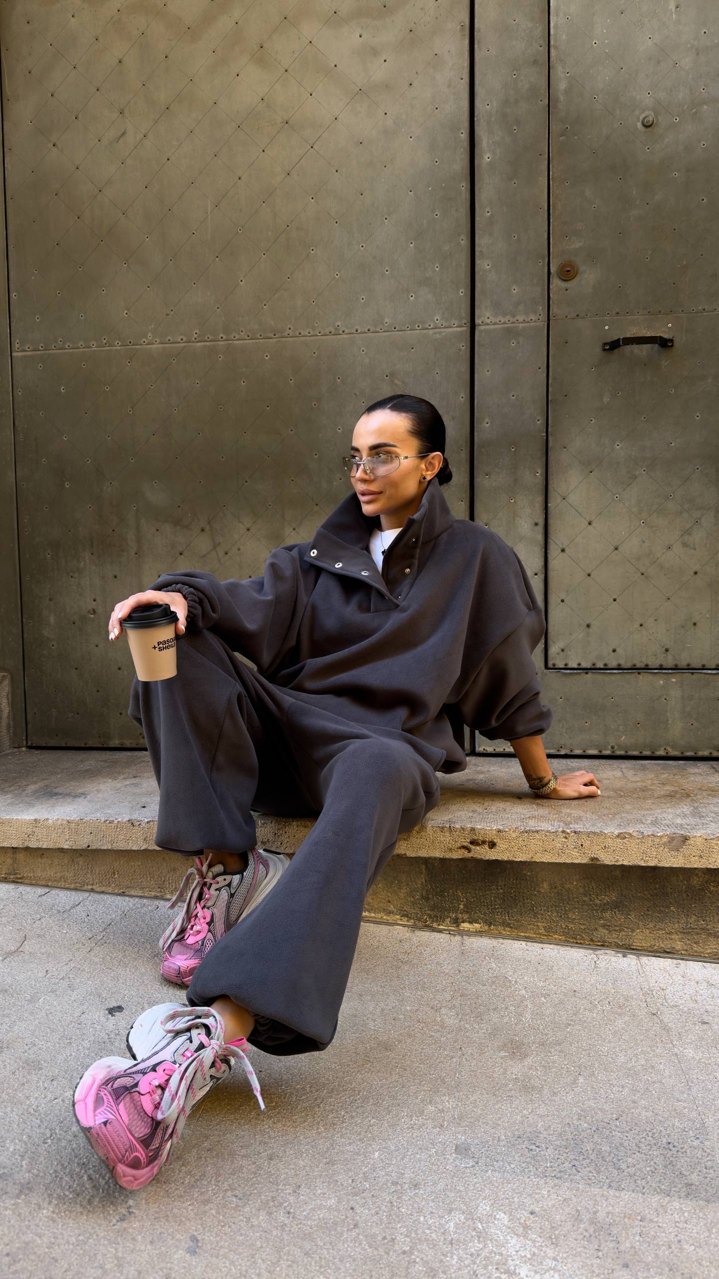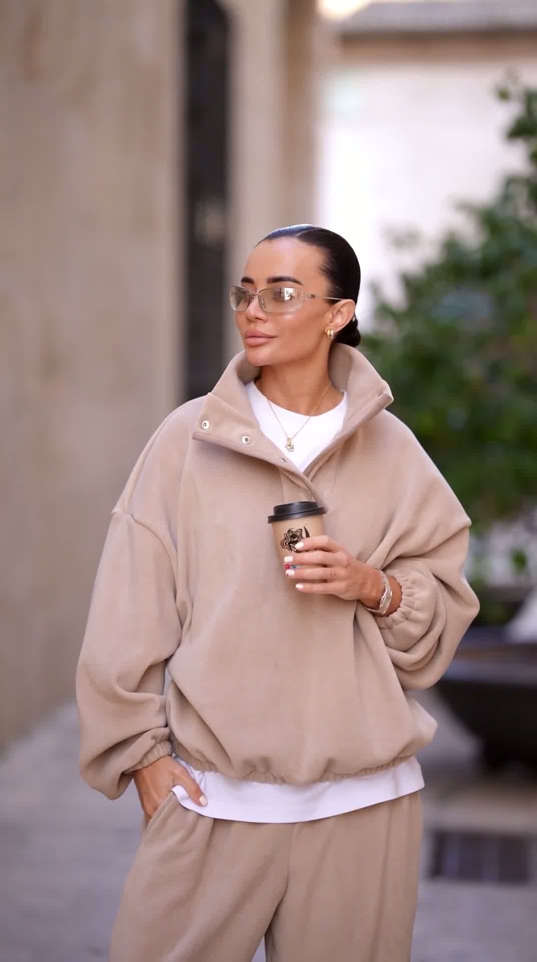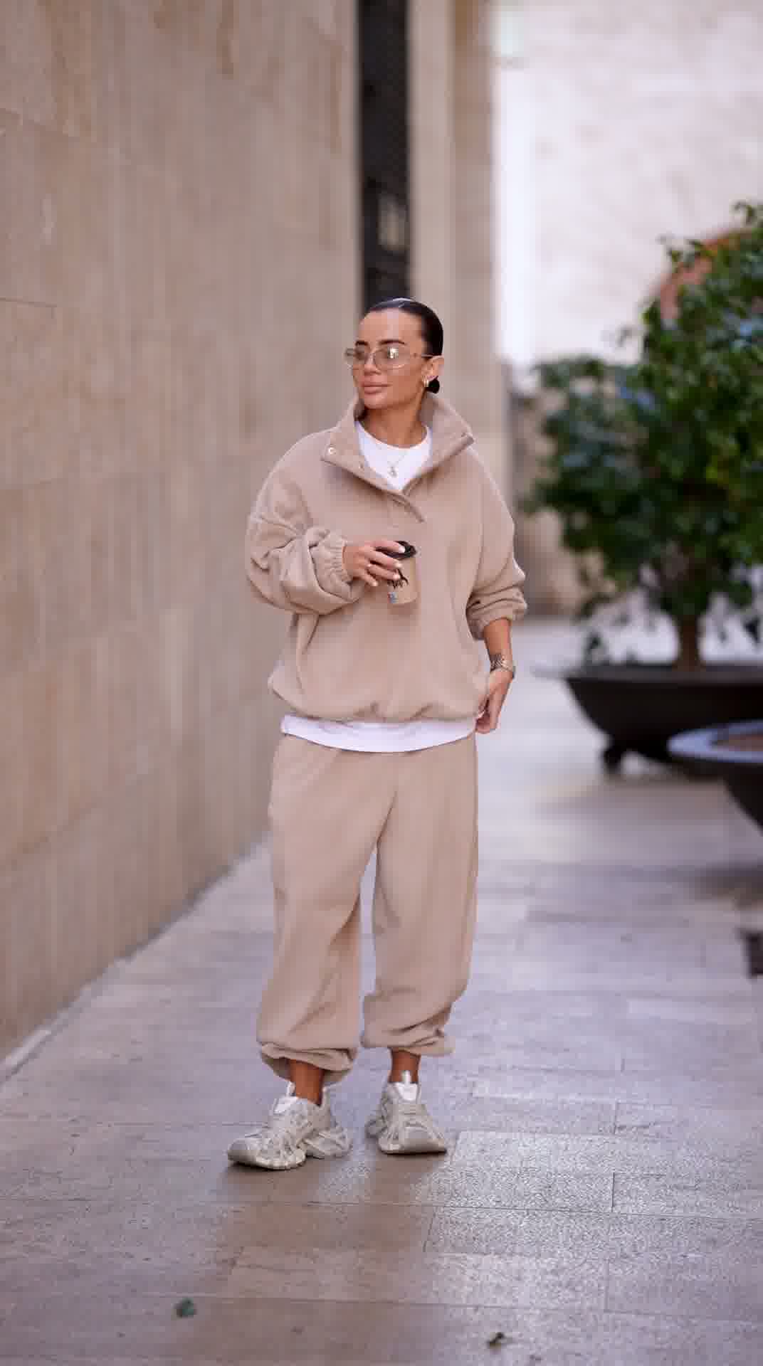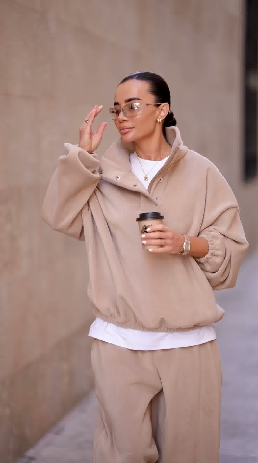 Stylowy komplet dresowy wykonany z miękkiego i ciepłego materiału typu fleece. Model o luźnym kroju oversize zapewnia maksymalny komfort i swobodę ruchów. Bluza z wysoką stójką i napami nadaje nowoczesnego charakteru, a spodnie z elastyczną talią i ściągaczami tworzą modny, miejski look. Idealny na co dzień, podróże, spacery oraz casualowe stylizacje.