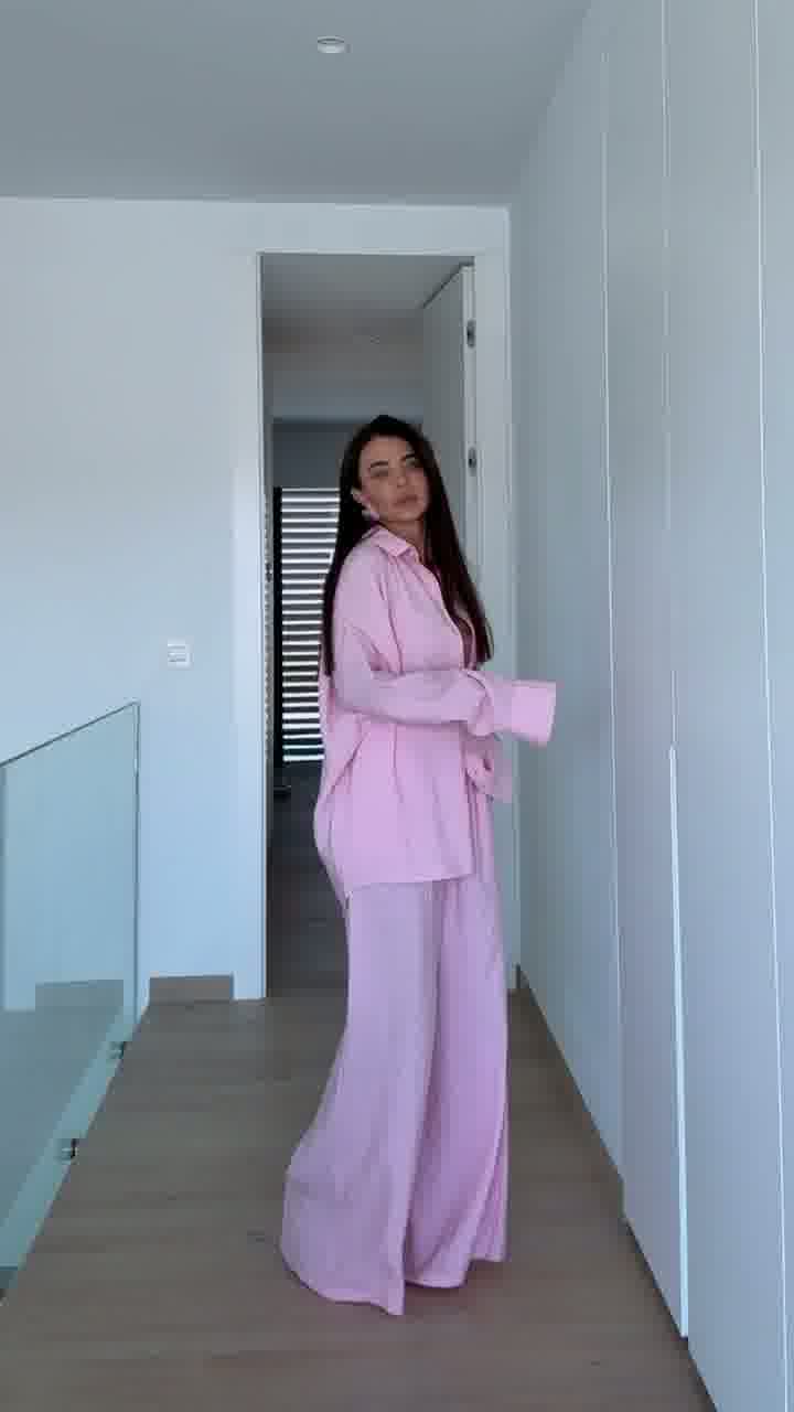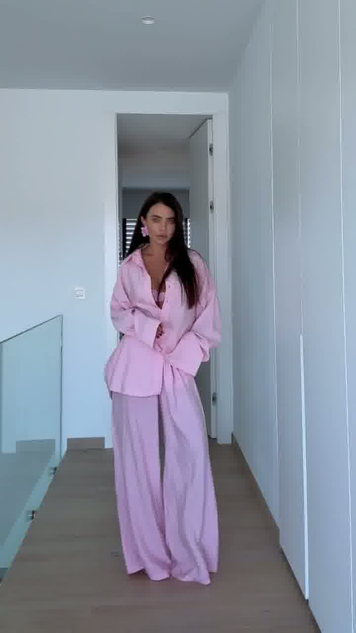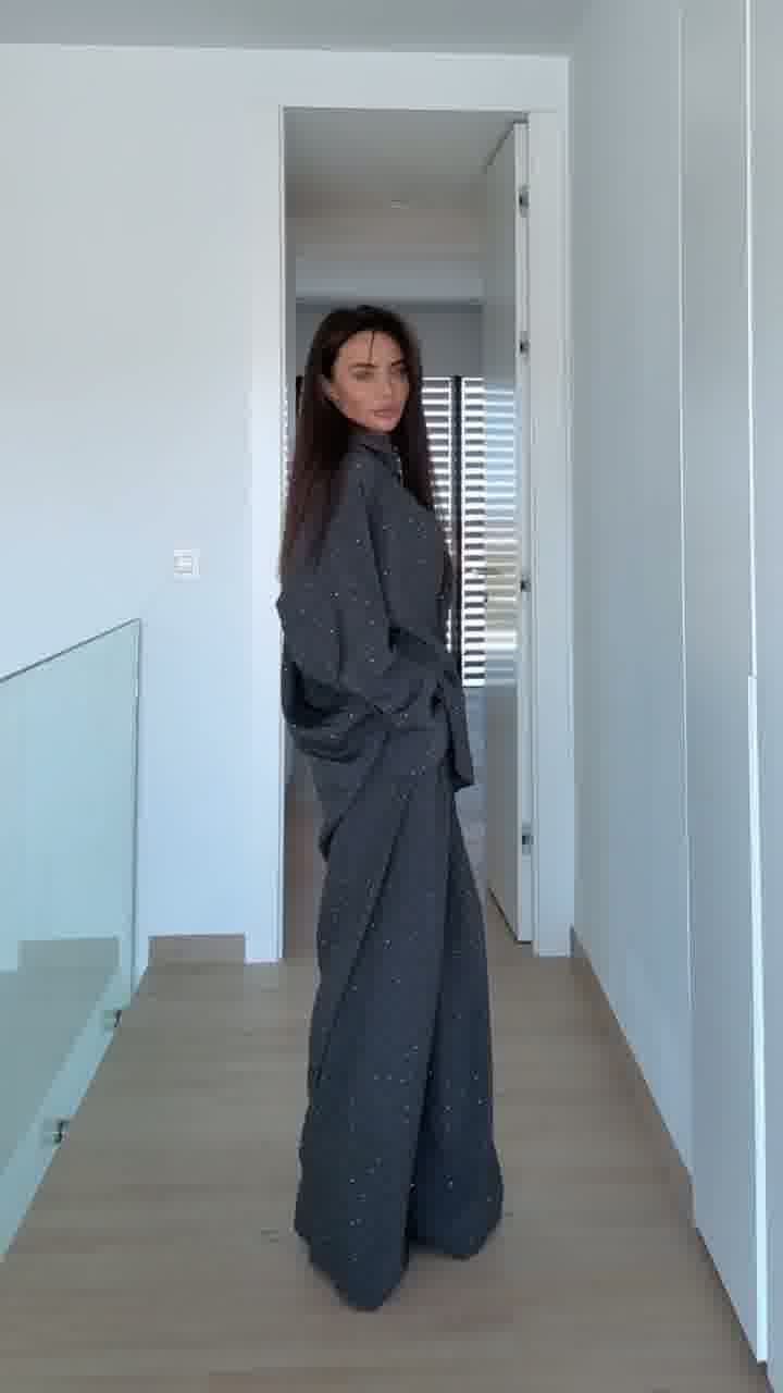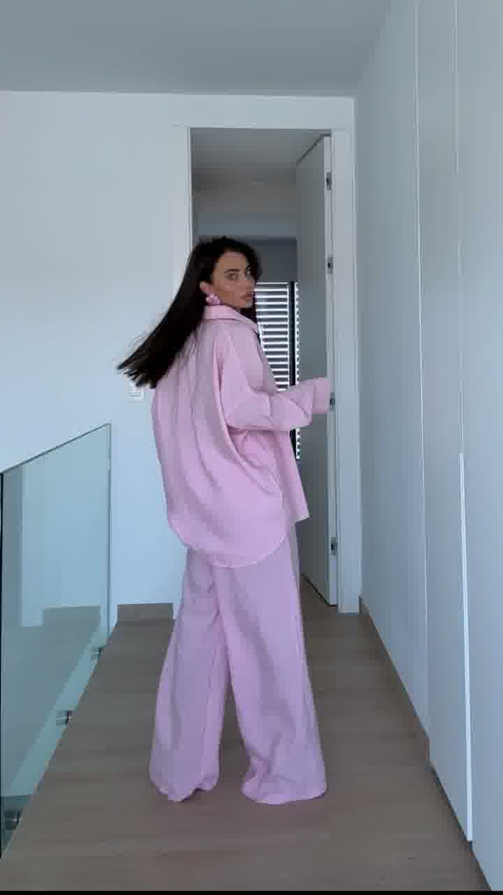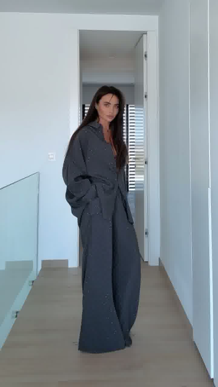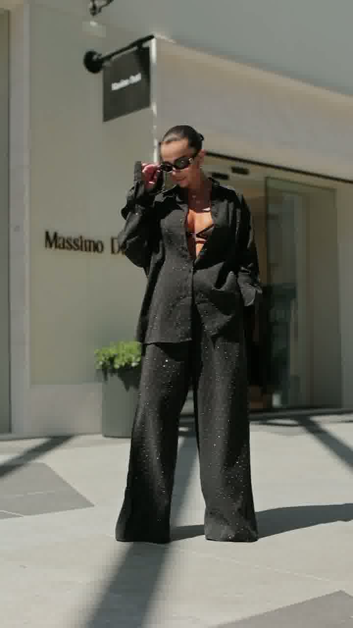 Stylowy komplet składający się z luźnej koszuli i szerokich spodni, ozdobiony delikatnymi cyrkoniami (efekt subtelnego błysku). Idealny wybór na co dzień w wersji premium lub na wyjścia w stylu effortless chic.