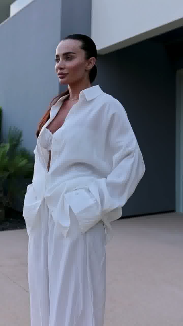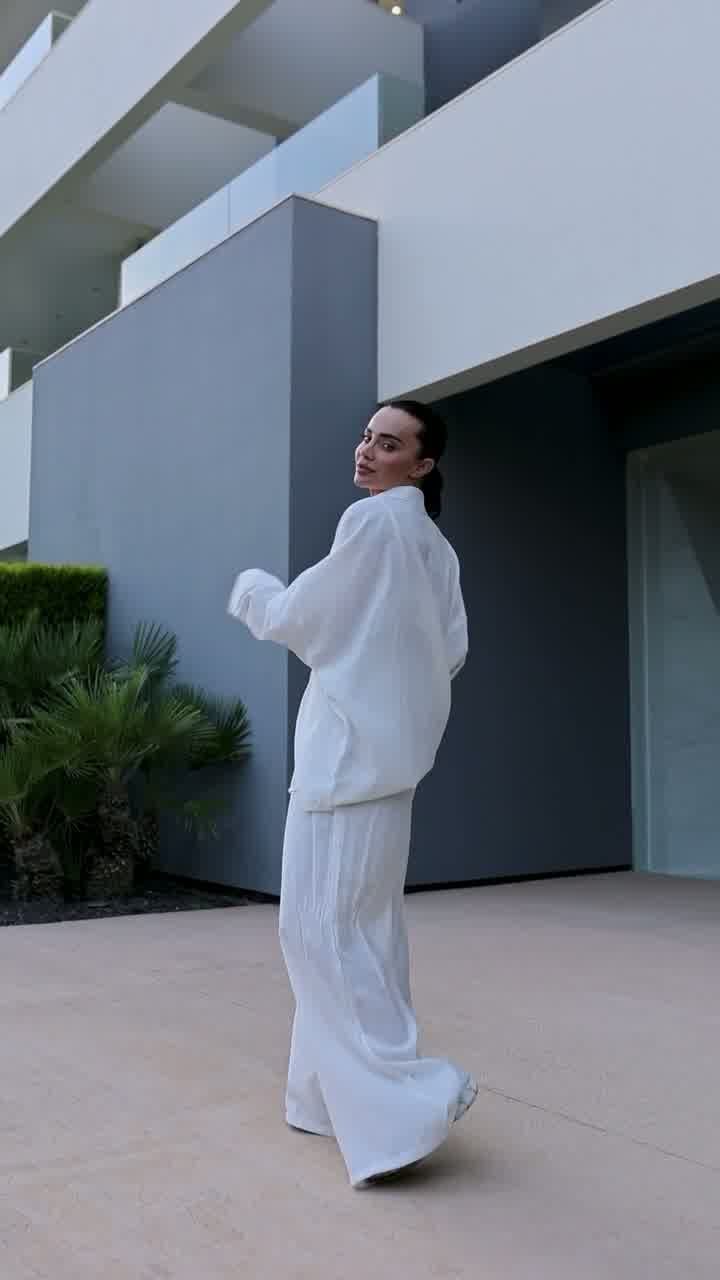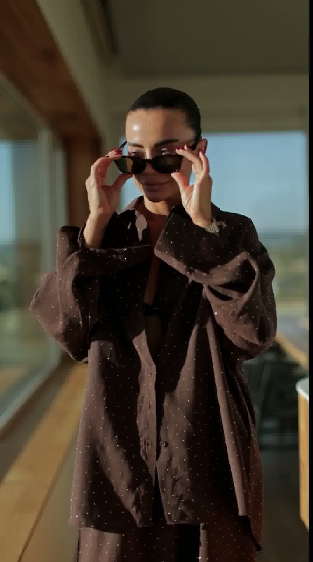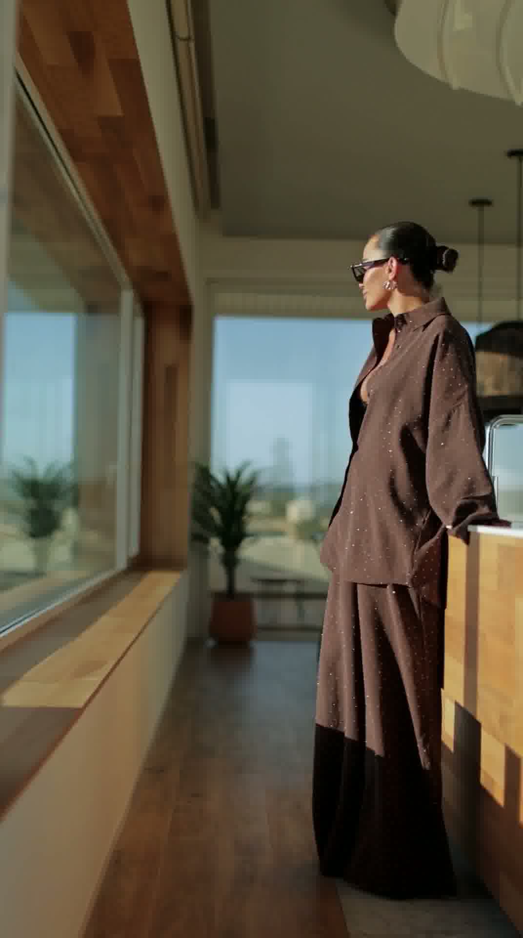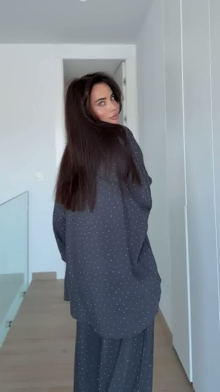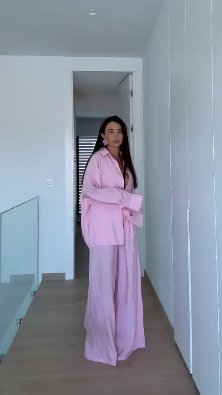 Stylowy komplet składający się z luźnej koszuli i szerokich spodni, ozdobiony delikatnymi cyrkoniami (efekt subtelnego błysku). Idealny wybór na co dzień w wersji premium lub na wyjścia w stylu effortless chic.