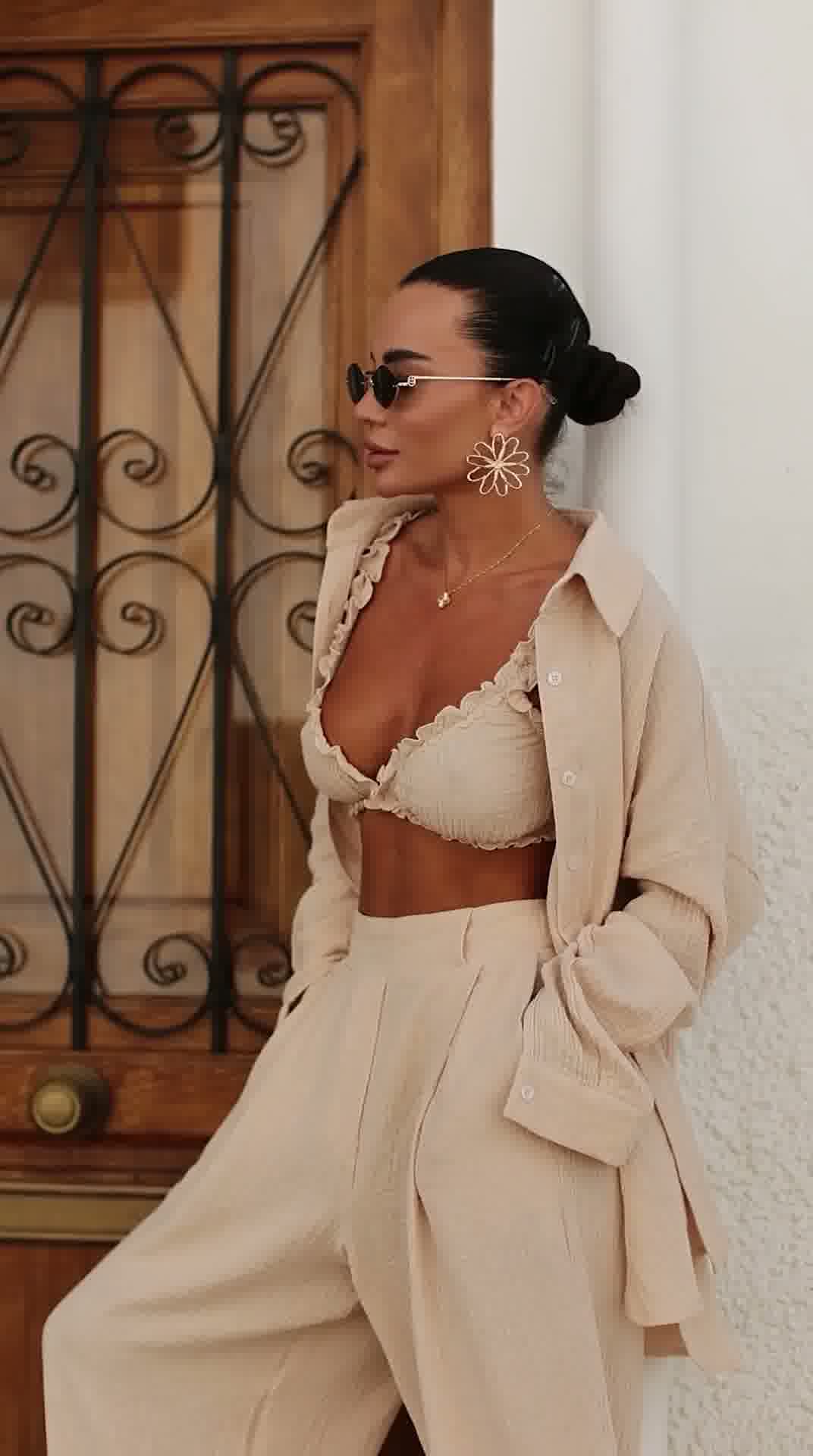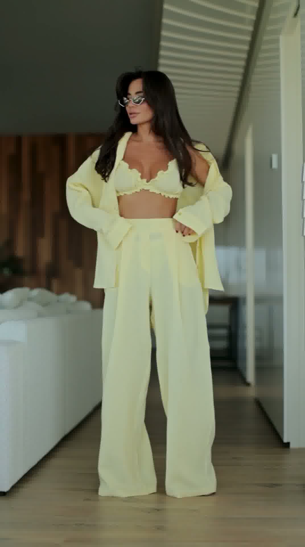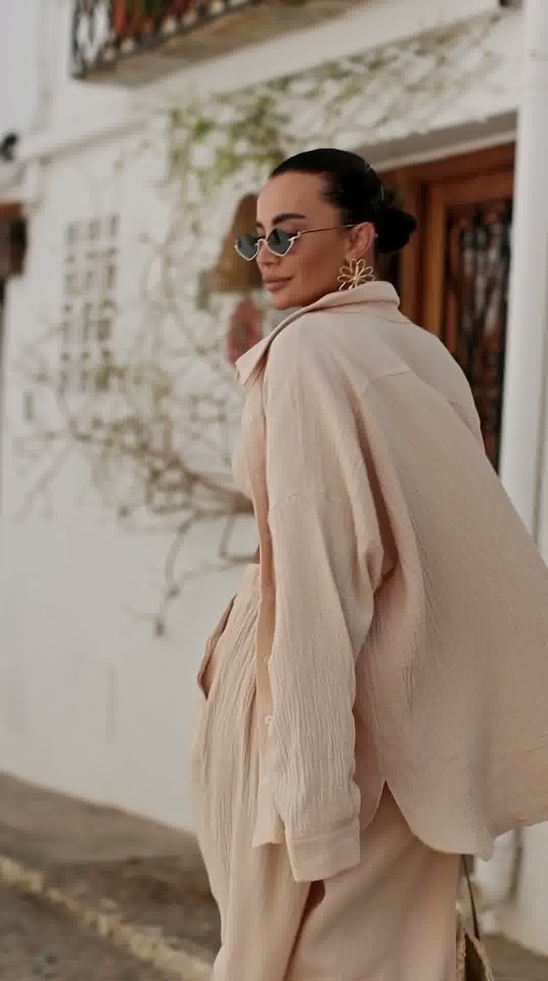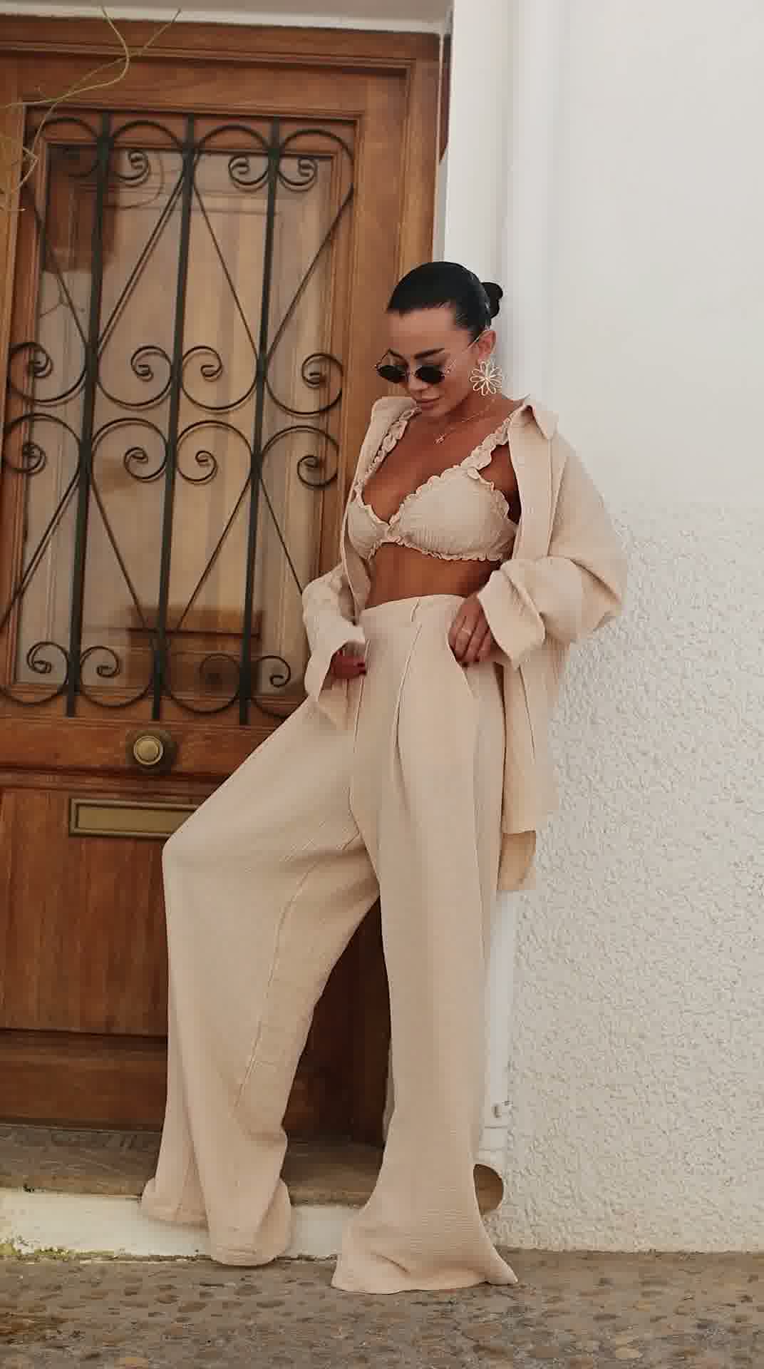 Stylowy i niezwykle wygodny komplet wykonany z naturalnego lnu, który idealnie sprawdzi się w letnich stylizacjach. Zestaw składa się z luźnej koszuli, kobiecego topu oraz szerokich spodni, tworząc modny i spójny look.