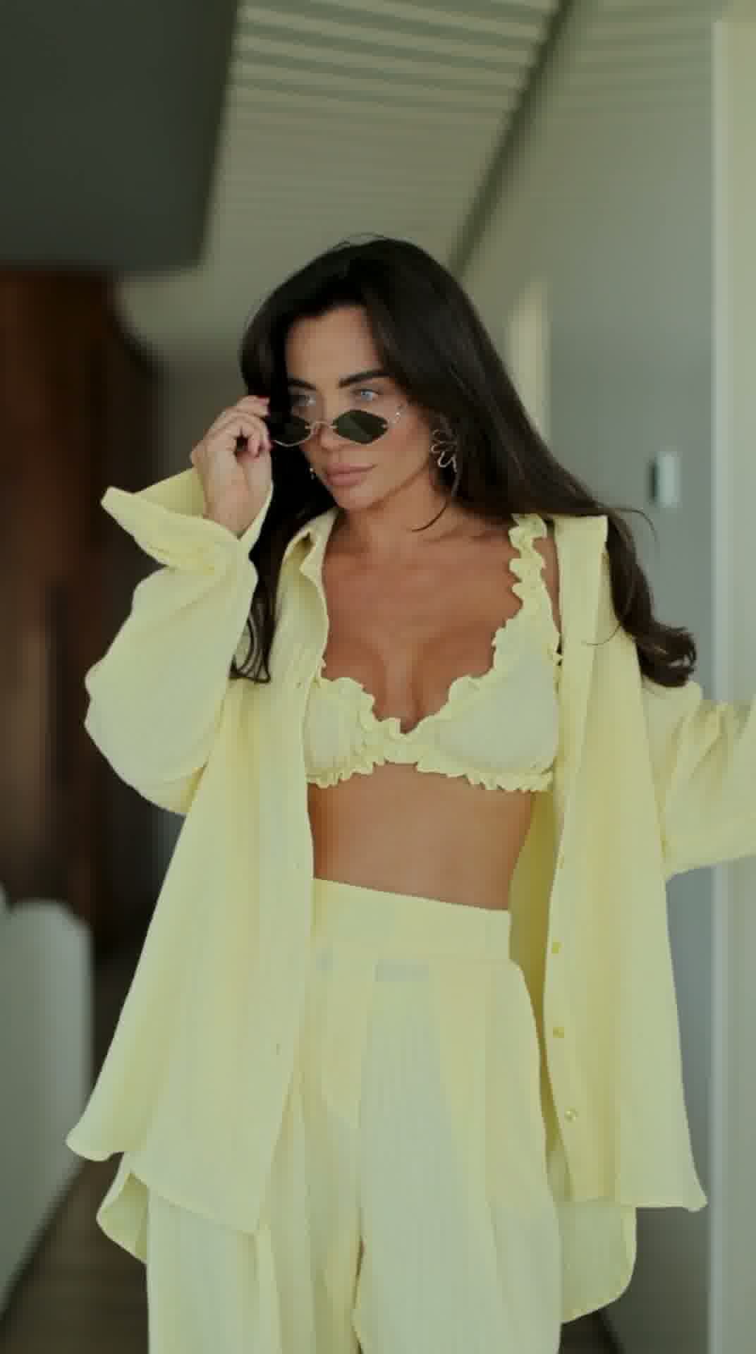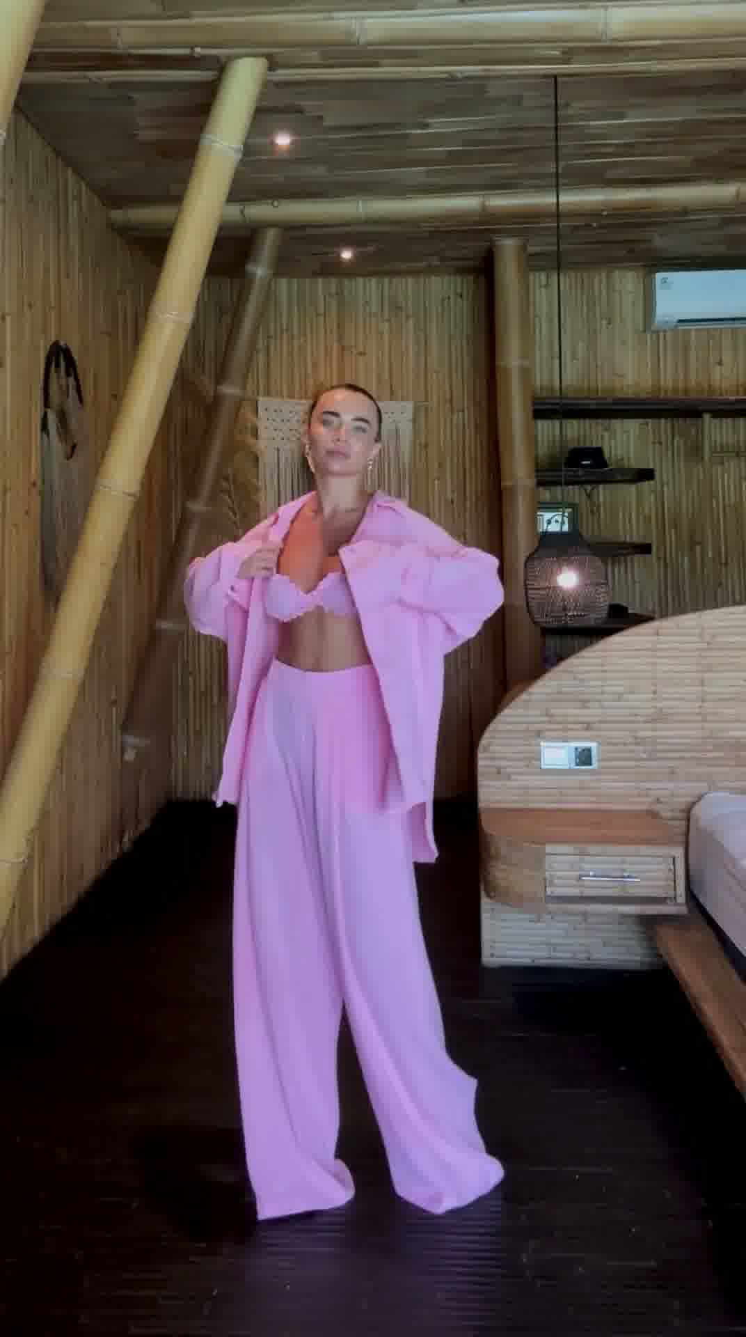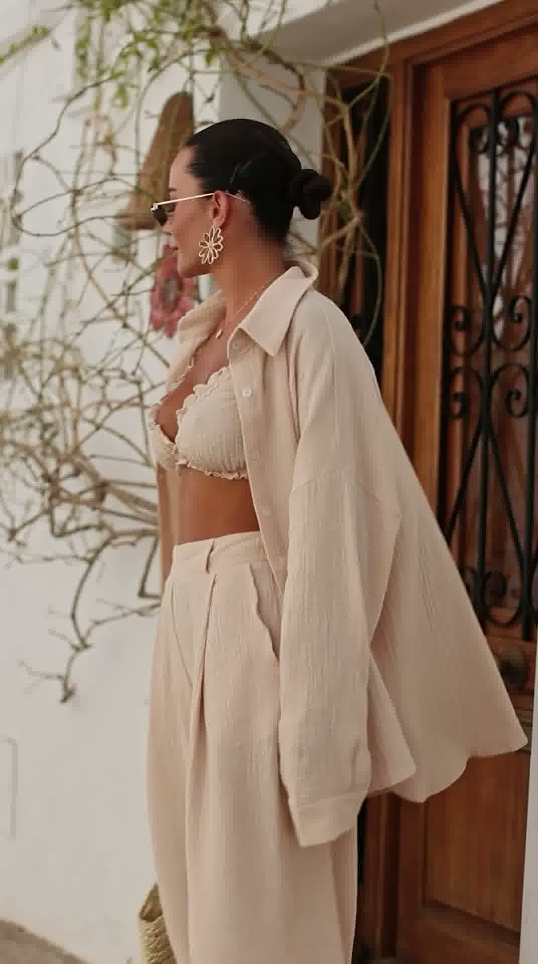 Stylowy i niezwykle wygodny komplet wykonany z naturalnego lnu, który idealnie sprawdzi się w letnich stylizacjach. Zestaw składa się z luźnej koszuli, kobiecego topu oraz szerokich spodni, tworząc modny i spójny look.