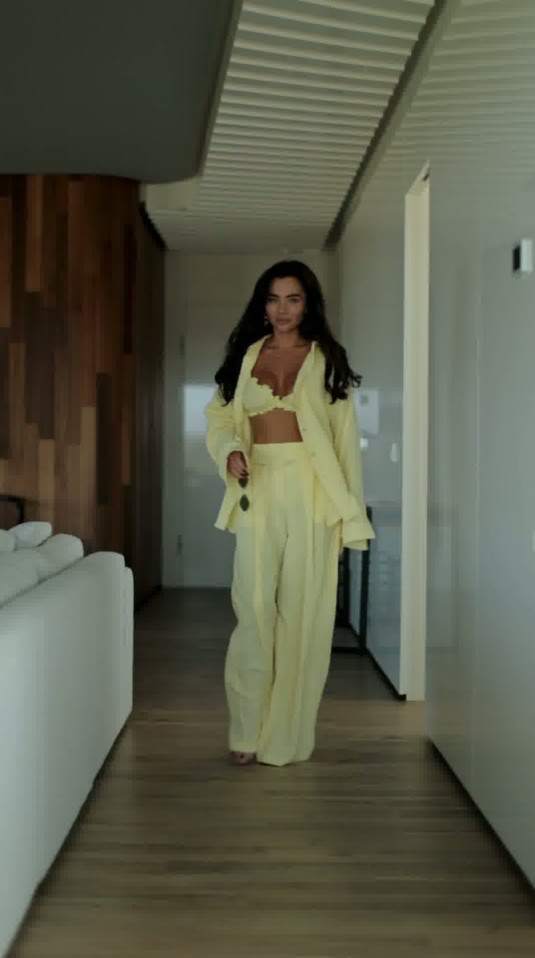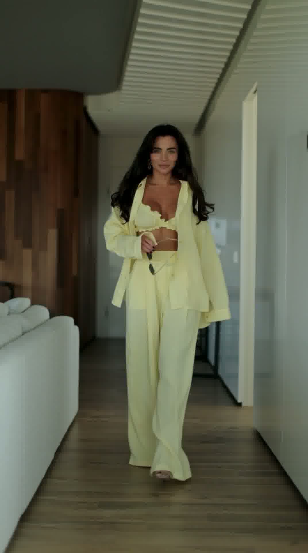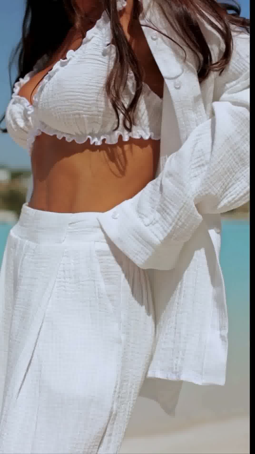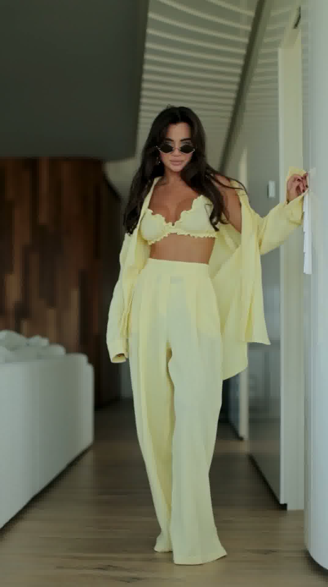 Stylowy i niezwykle wygodny komplet wykonany z naturalnego lnu, który idealnie sprawdzi się w letnich stylizacjach. Zestaw składa się z luźnej koszuli, kobiecego topu oraz szerokich spodni, tworząc modny i spójny look.
