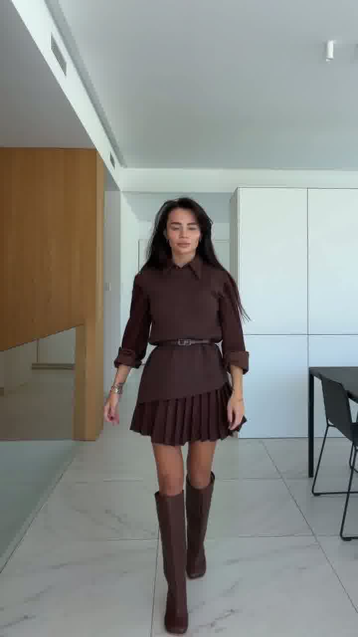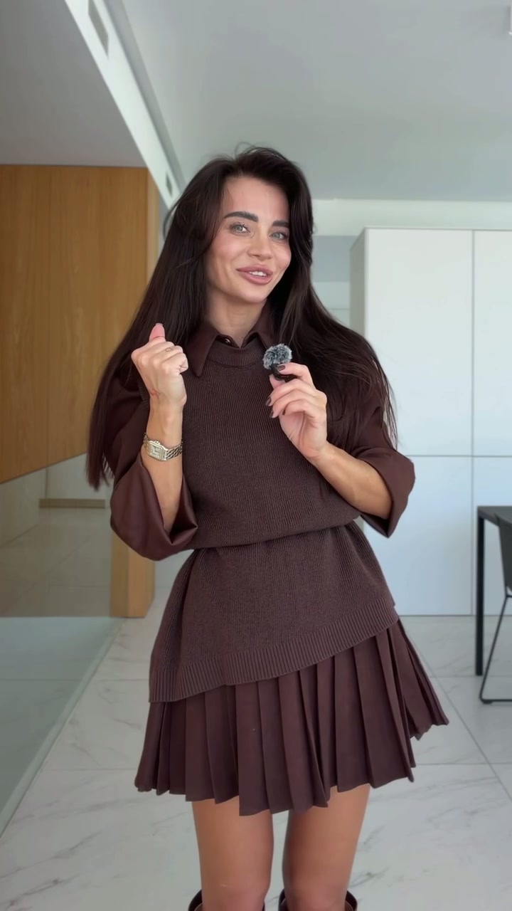 Stylowy komplet składający się z sukienki w kratę oraz dopasowanej kamizelki. Model łączy elegancję z modnym, szkolnym klimatem w nowoczesnym wydaniu. Plisowany dół dodaje lekkości, a kamizelka podkreśla talię i nadaje stylizacji charakteru.