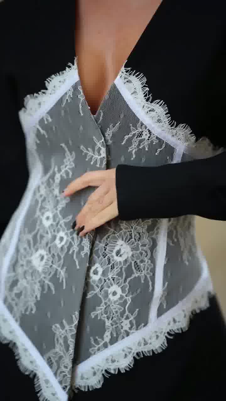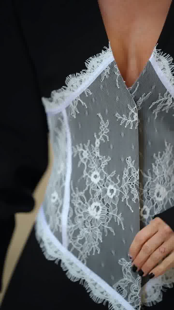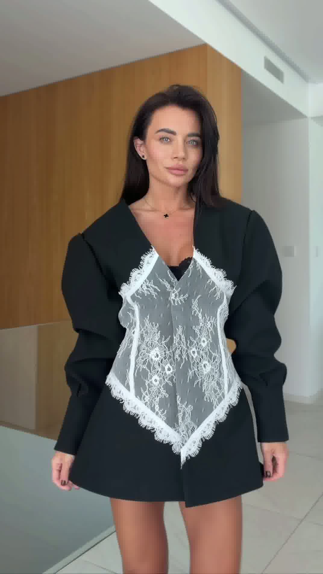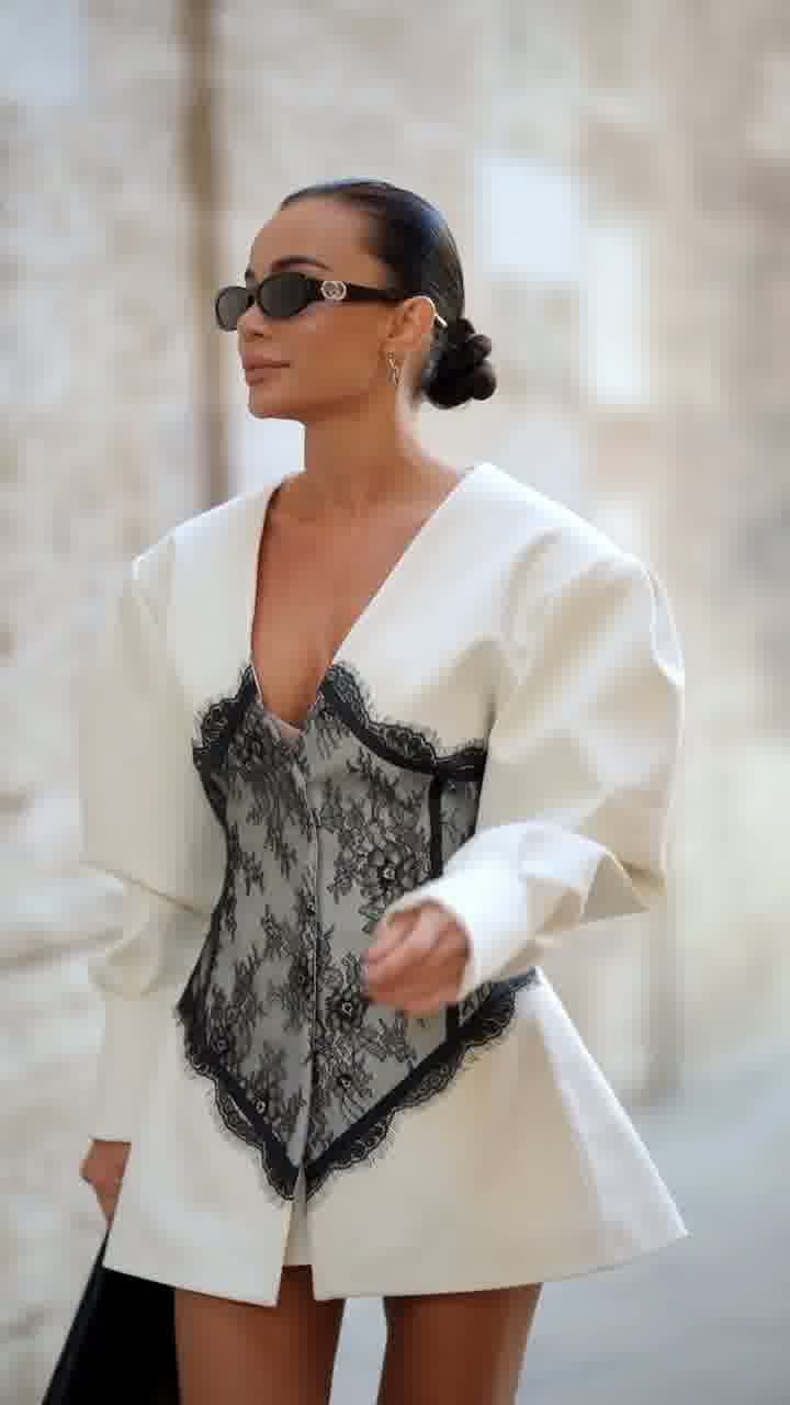 Elegancki model w fasonie marynarki, podkreślający talię dzięki kontrastowej koronkowej wstawce. Połączenie klasycznej formy z kobiecym, zmysłowym akcentem.