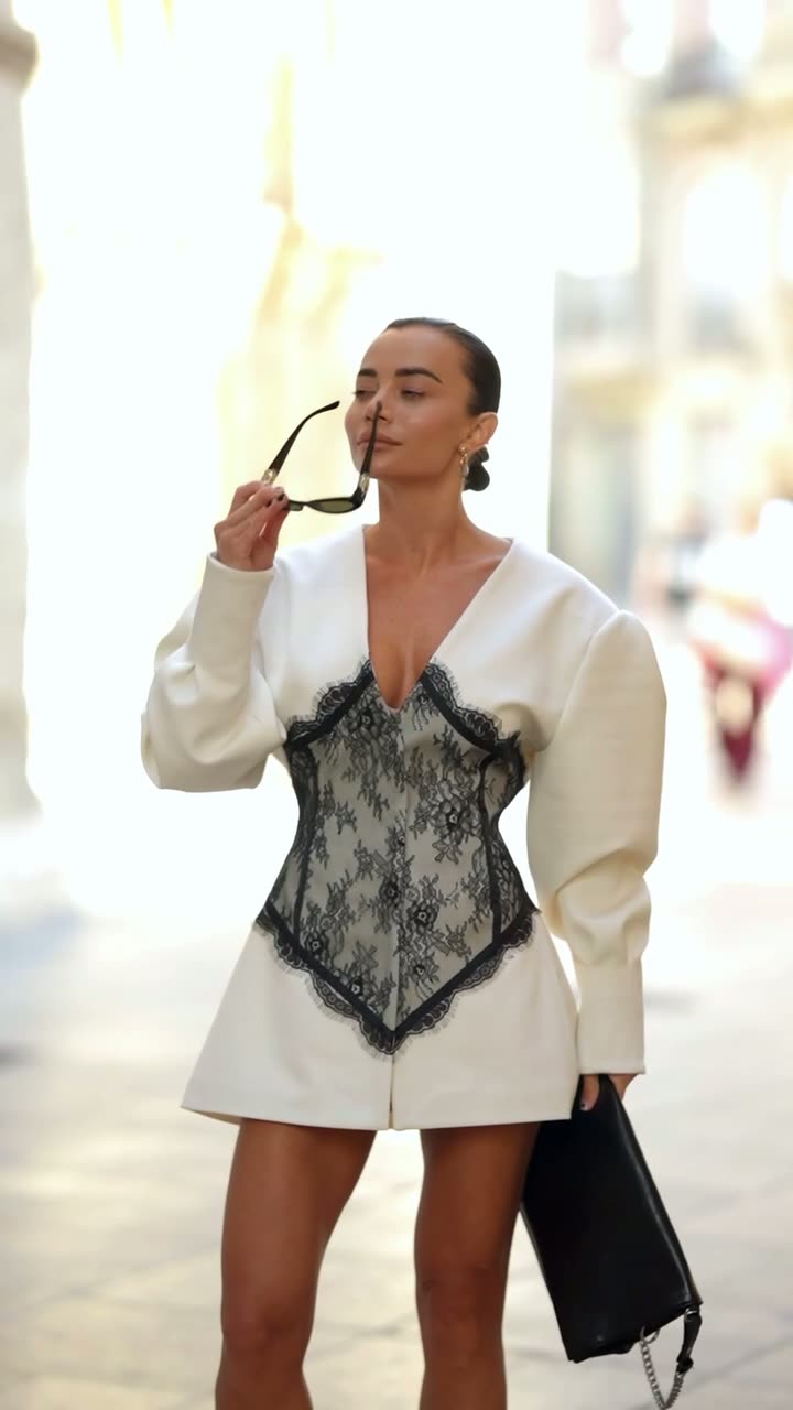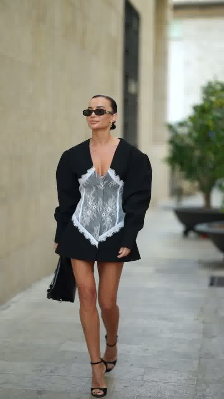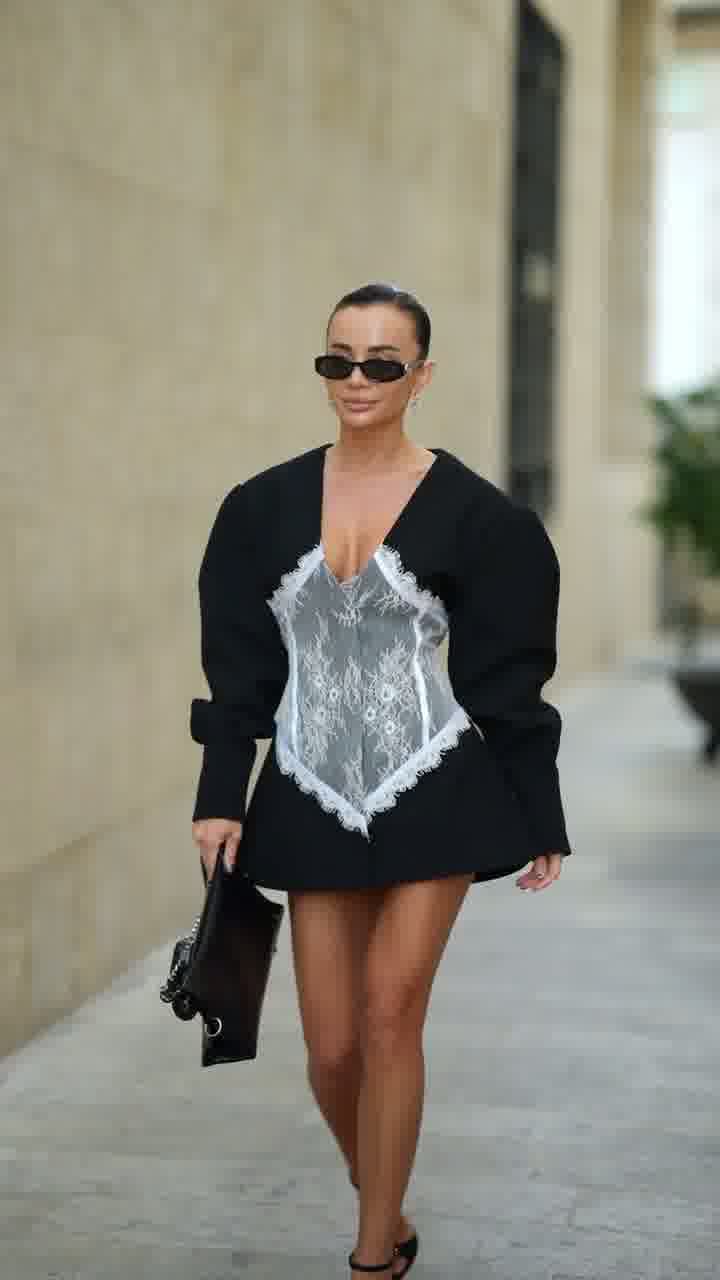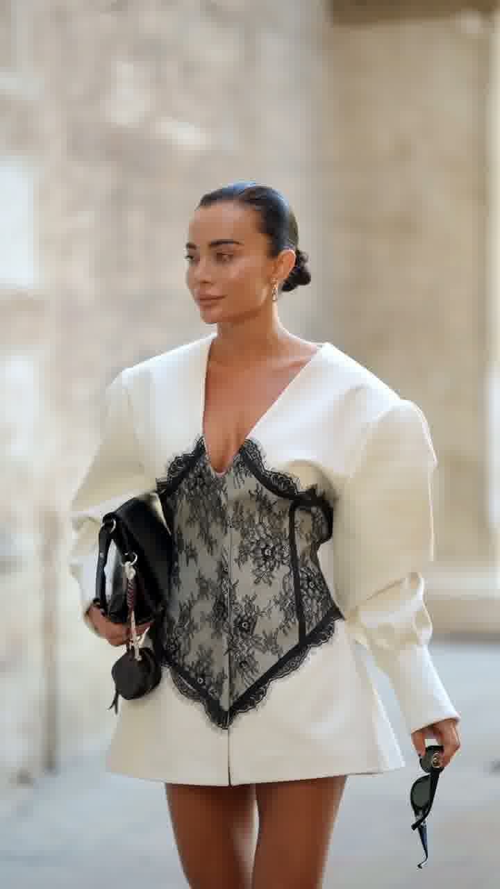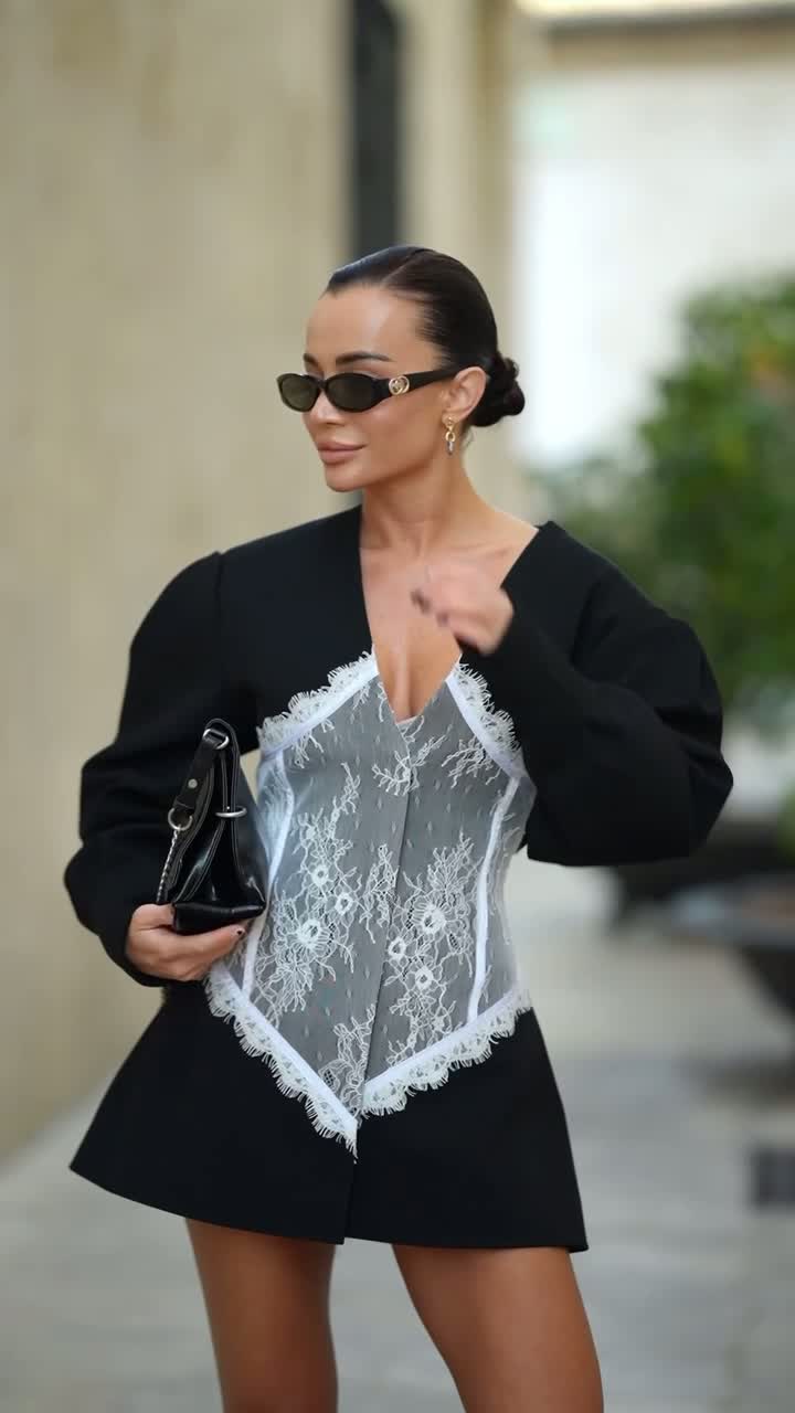 Elegancki model w fasonie marynarki, podkreślający talię dzięki kontrastowej koronkowej wstawce. Połączenie klasycznej formy z kobiecym, zmysłowym akcentem.