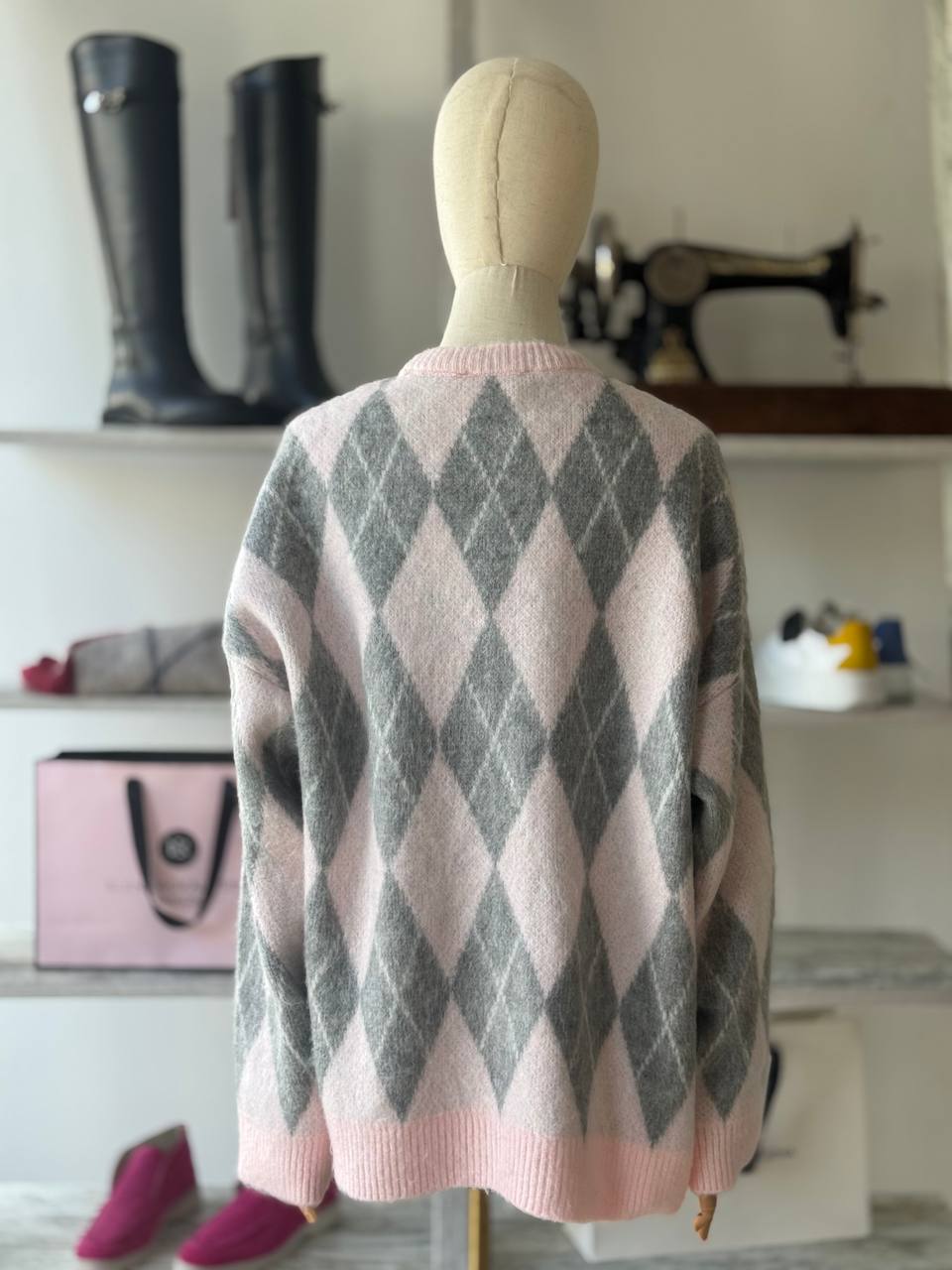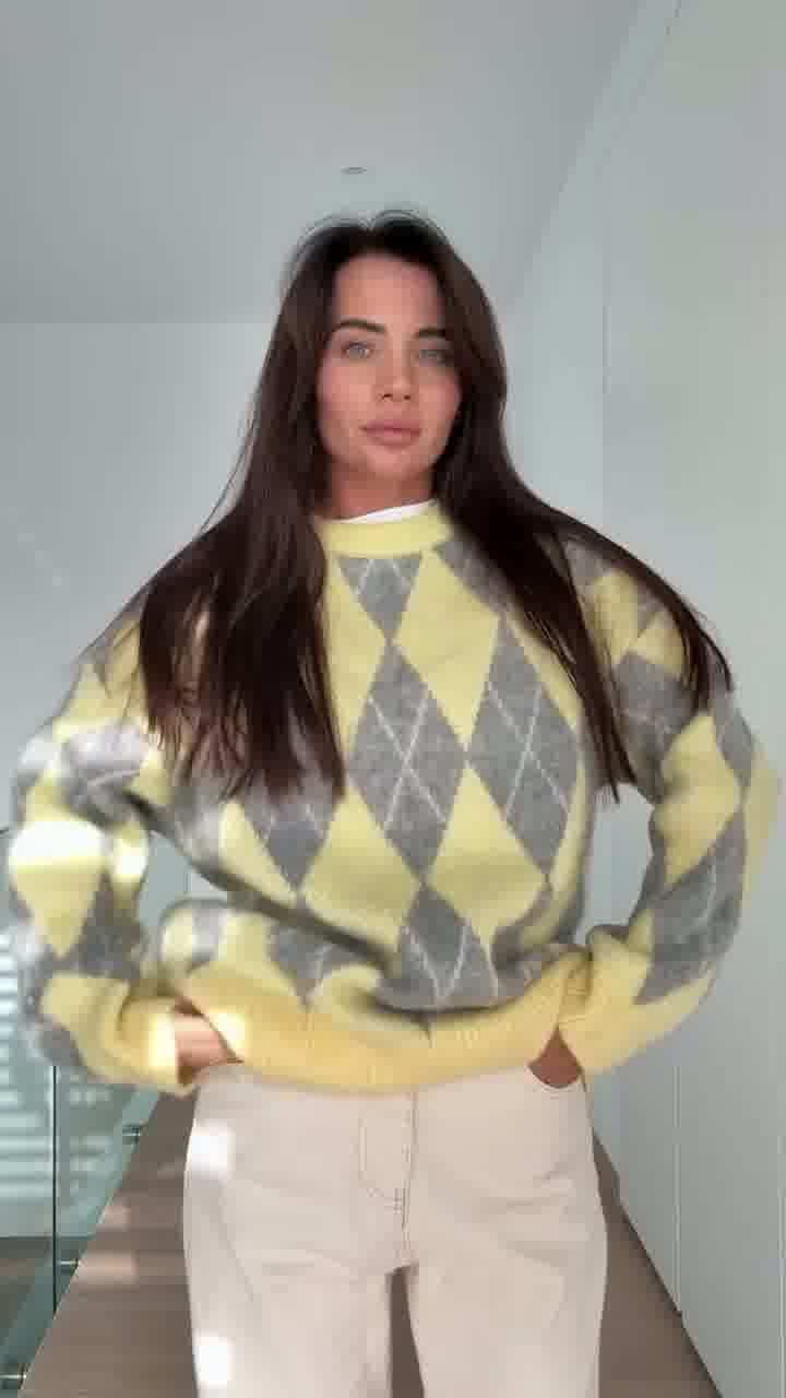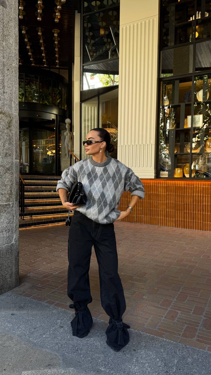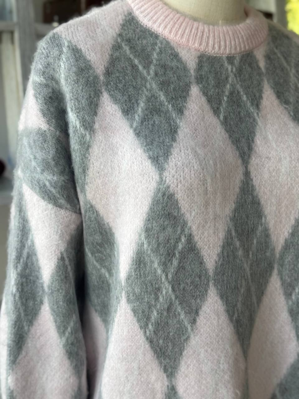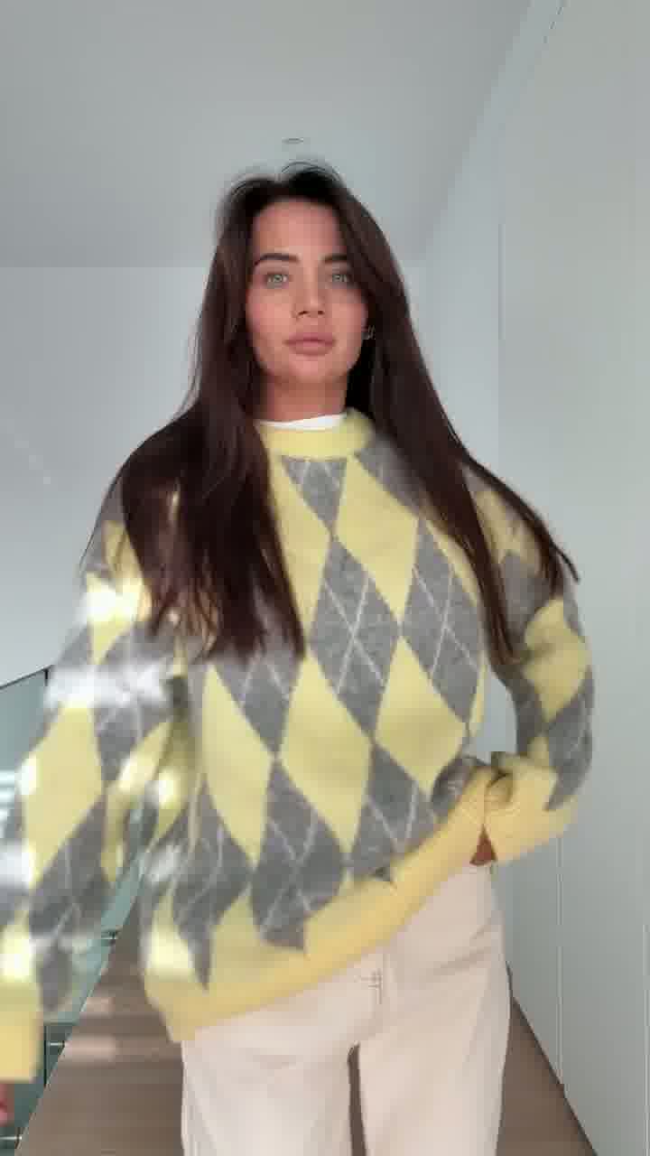 Modny sweter damski o klasycznym wzorze w romby, który łączy styl retro z nowoczesną modą miejską. Idealny wybór do codziennych stylizacji – świetnie komponuje się z jeansami, spodniami materiałowymi oraz sneakersami czy botkami. To uniwersalny model na jesień i zimę, który sprawdzi się zarówno na co dzień, jak i w casualowych stylizacjach do pracy lub na wyjście do miasta.