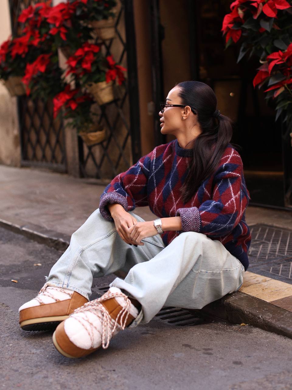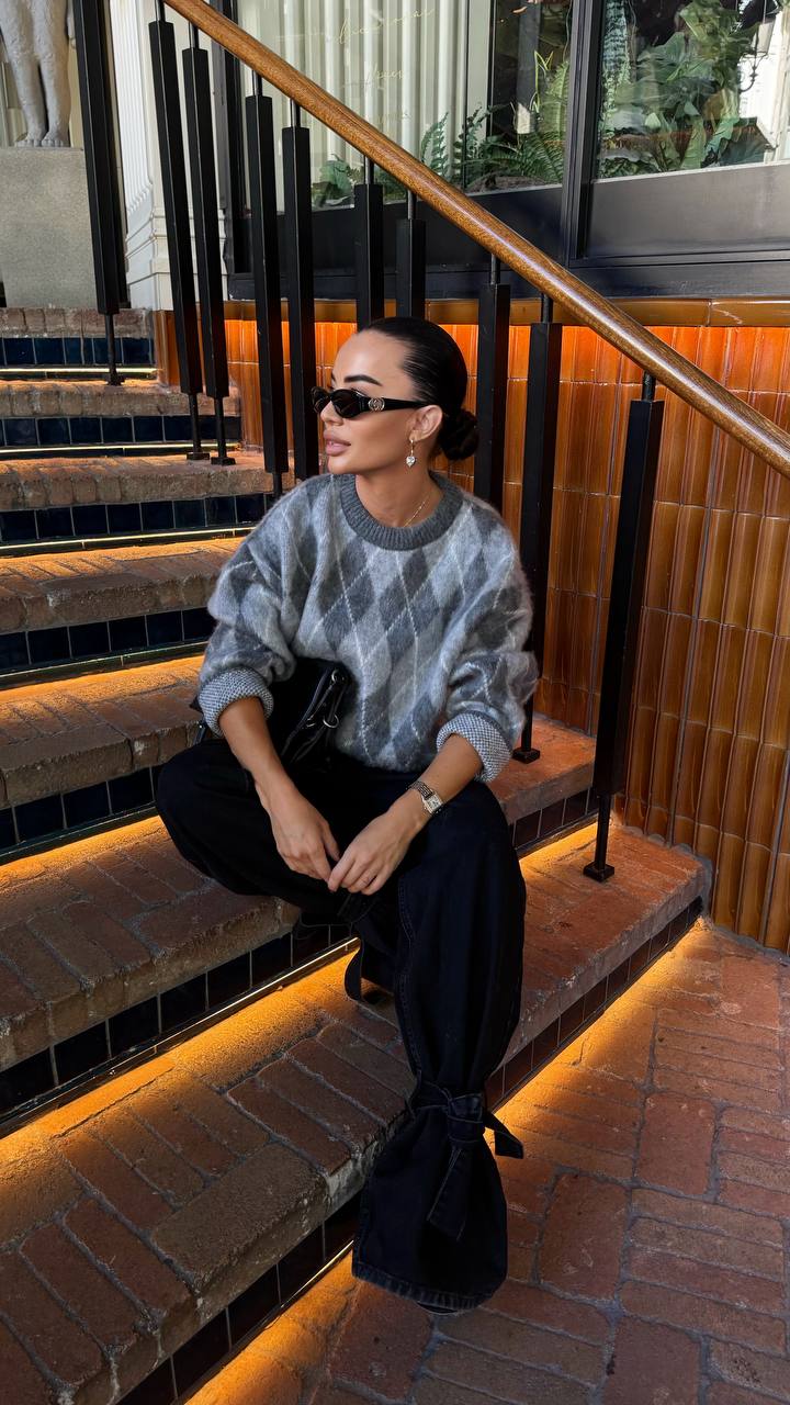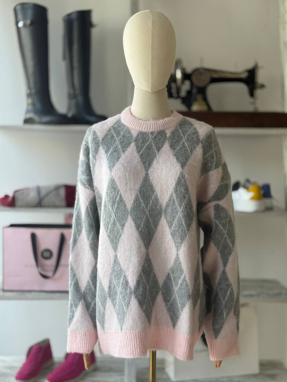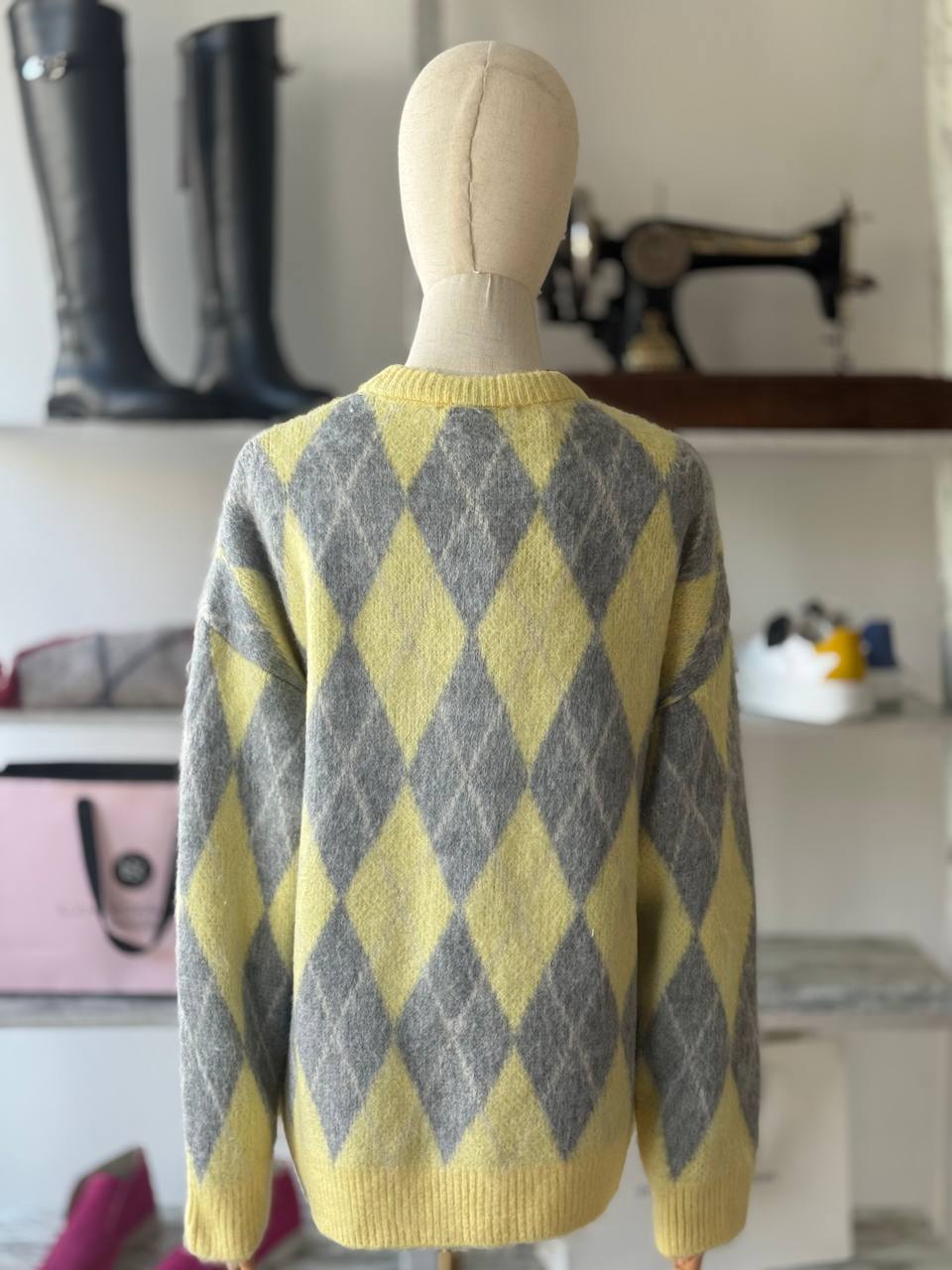 Modny sweter damski o klasycznym wzorze w romby, który łączy styl retro z nowoczesną modą miejską. Idealny wybór do codziennych stylizacji – świetnie komponuje się z jeansami, spodniami materiałowymi oraz sneakersami czy botkami. To uniwersalny model na jesień i zimę, który sprawdzi się zarówno na co dzień, jak i w casualowych stylizacjach do pracy lub na wyjście do miasta.